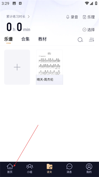 1、进入懂音律APP后,点击左下角【首页】,进入首页页面。
