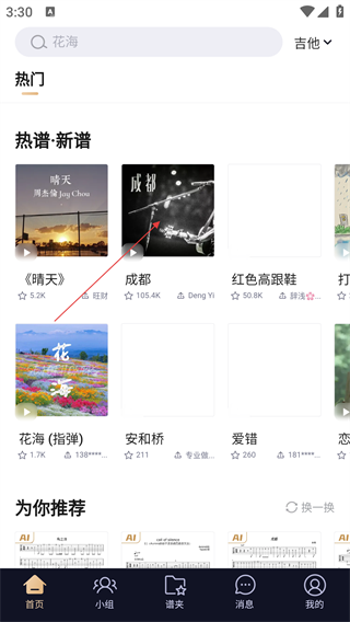 2、在首页页面找到热谱《成都》,点击进入该乐谱详情页。
