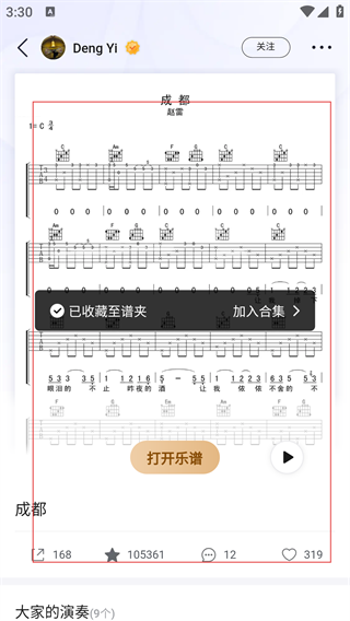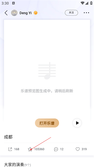 3、在乐谱详情页点击星星图标,即可将《成都》乐谱收藏至谱夹。