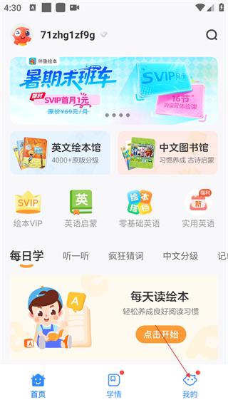 1、进入软件后,在首页可查看【英文绘本馆】【中文图书馆】等资源入口,点击底部【我的】进入个人界面。
