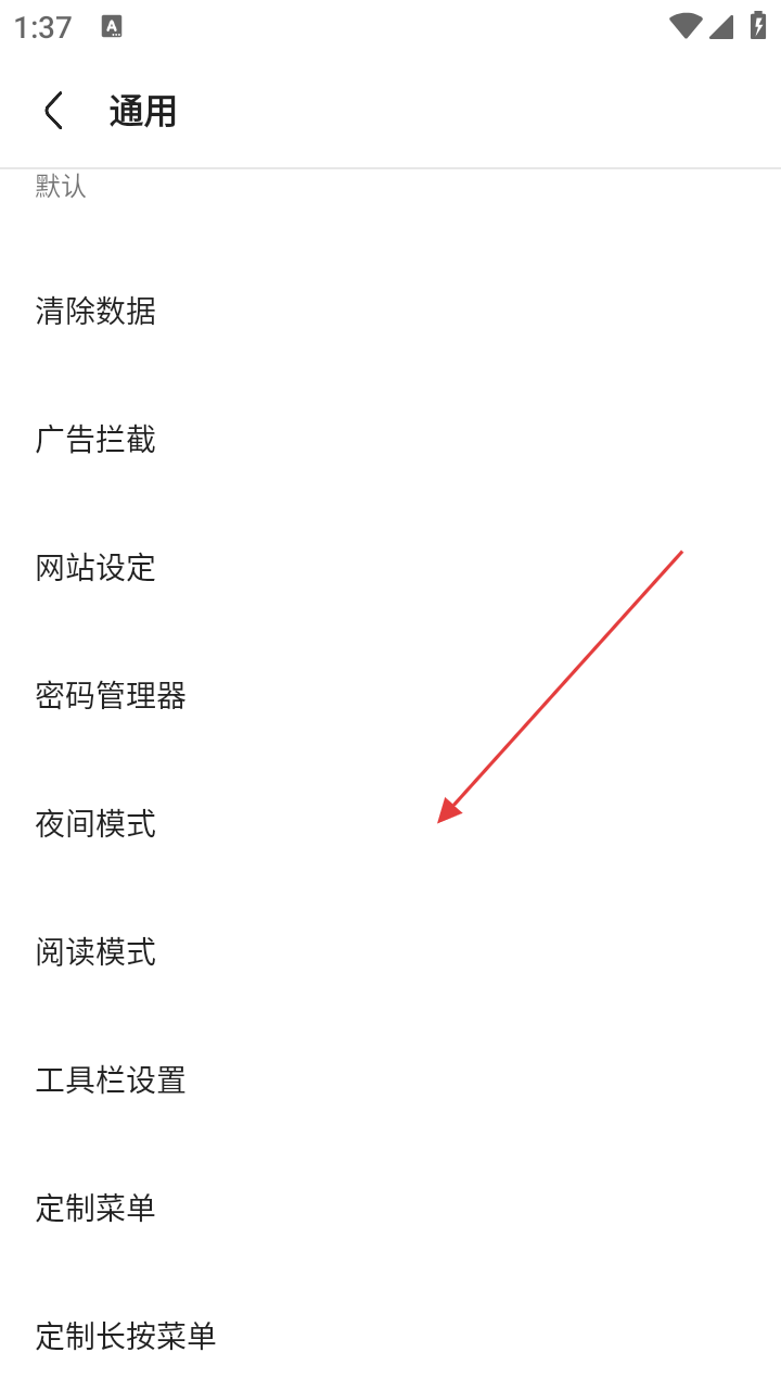 4、在通用设置页面,点击【夜间模式】即可开启夜间模式。