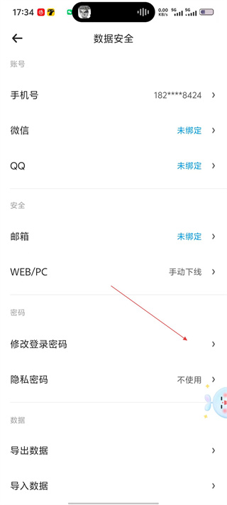 4、在数据安全页面,可修改登录密码、隐私密码,还可进行数据导出、导入操作,保障账号数据安全。