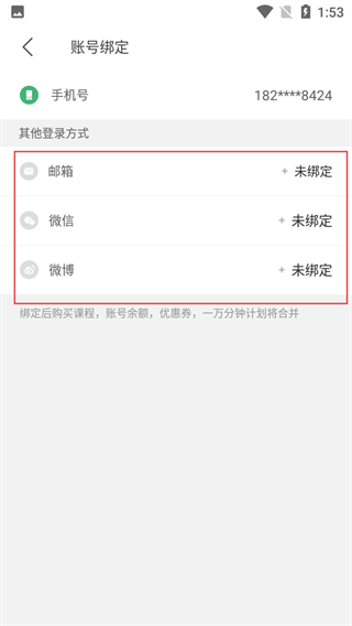 4、在“账号绑定”页面,可查看当前已绑定的手机号,并选择邮箱、微信、微博等其他登录方式进行绑定。