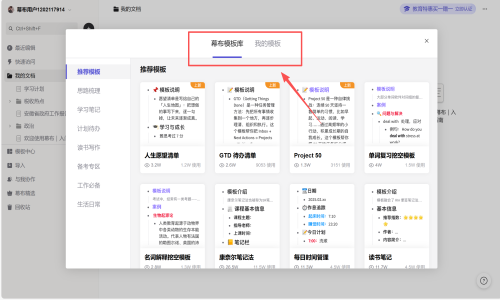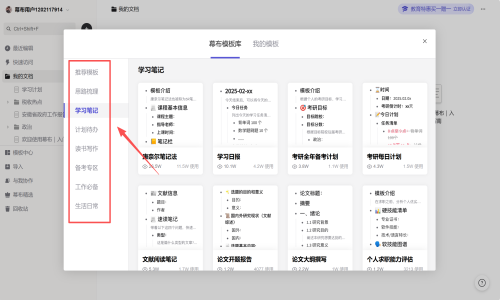 2、在模板库中选择“学习笔记”模板,点击“套用该模板”来创建新文档。