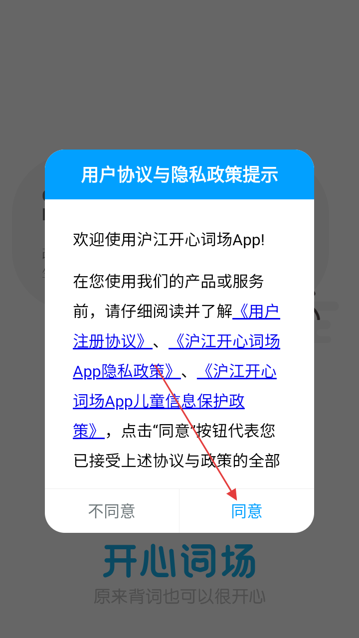 1、首次使用沪江开心词场App,会弹出【用户协议与隐私政策提示】窗口,仔细阅读后点击【同意】,即可进入下一步。