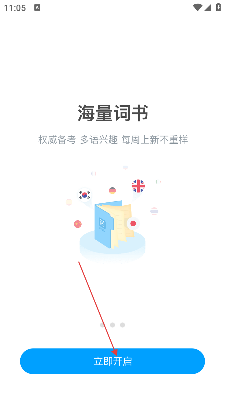 2、同意协议后,进入展示【海量词书】的页面,该页面介绍词书优势,点击【立即开启】,进入注册/登录环节。