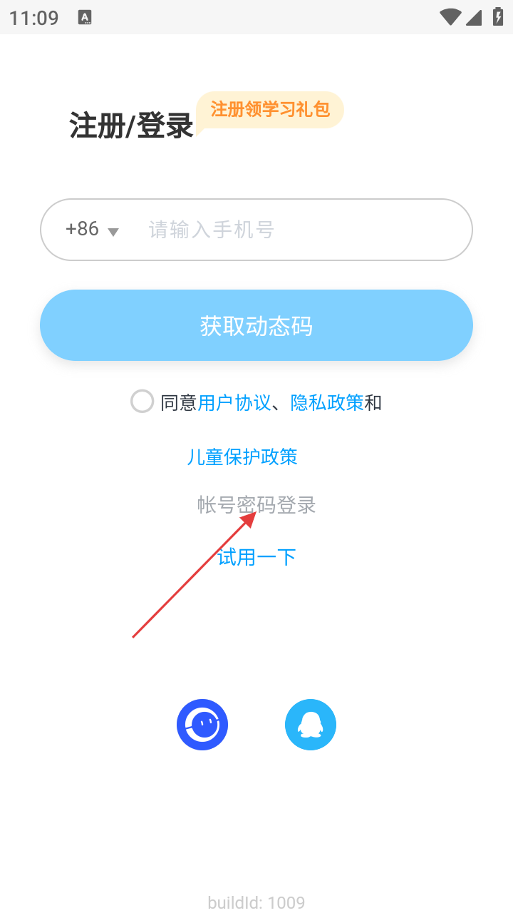 3、进入注册/登录页面,若选择帐号密码登录,点击【帐号密码登录】选项,切换到相应登录界面。
