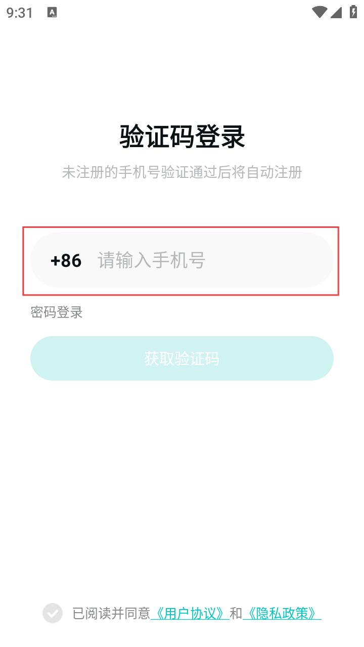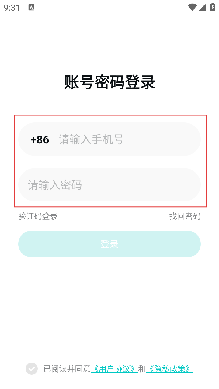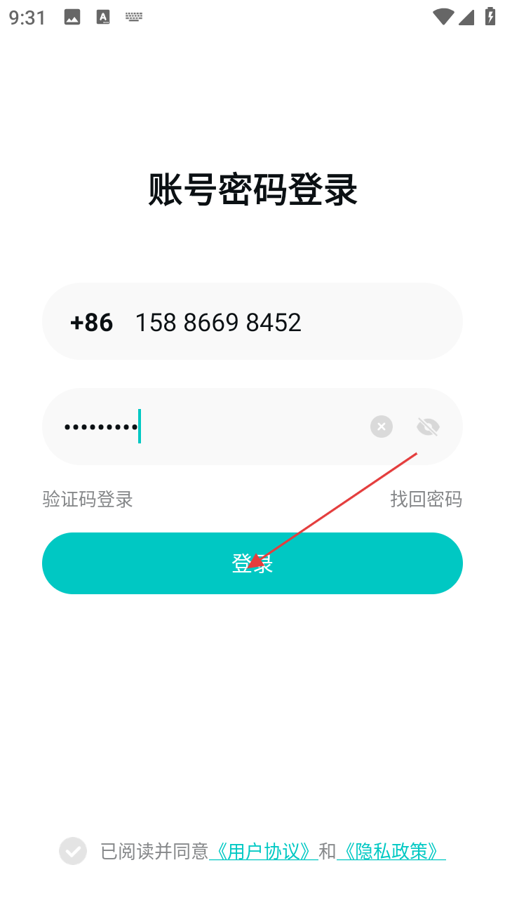 3、在账号密码登录页面,输入手机号和密码,勾选同意相关协议。