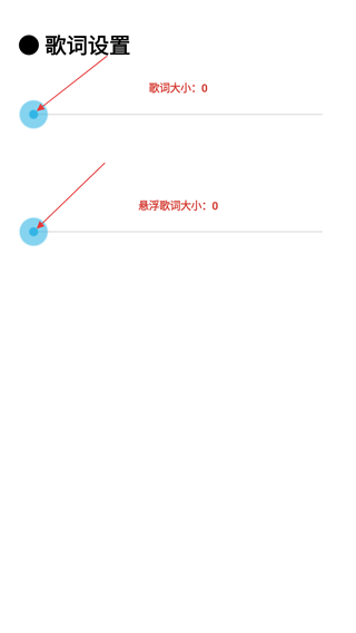 3、进入【歌词设置】界面后,初始状态下【歌词大小】与【悬浮歌词大小】,需拖动滑块调整显示尺寸。