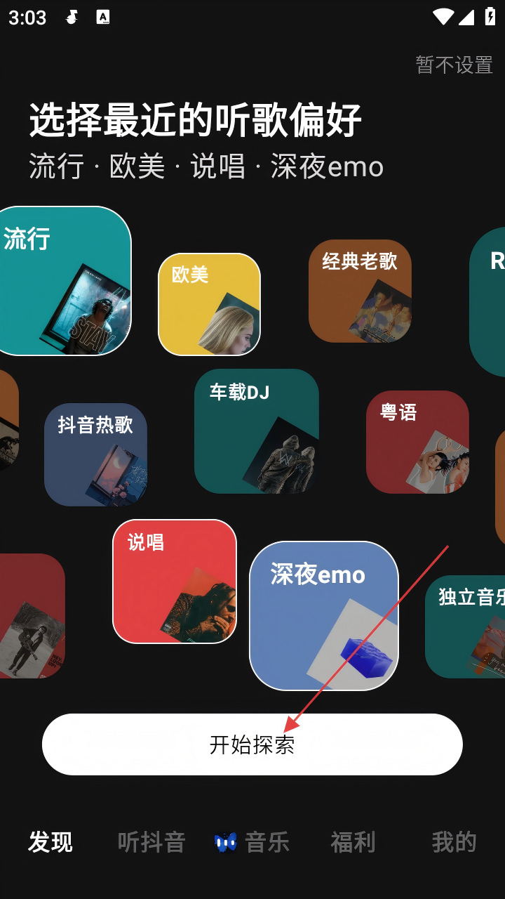 1、进入汽水音乐APP,选听歌偏好后,点击【开始探索】,开启音乐探索之旅。