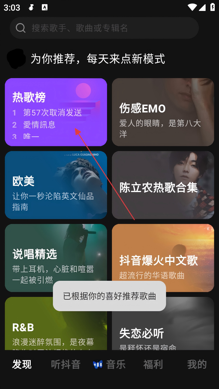 2、汽水音乐会依据偏好推荐歌单,若对热歌感兴趣,可点击【热歌榜】查看相关内容。