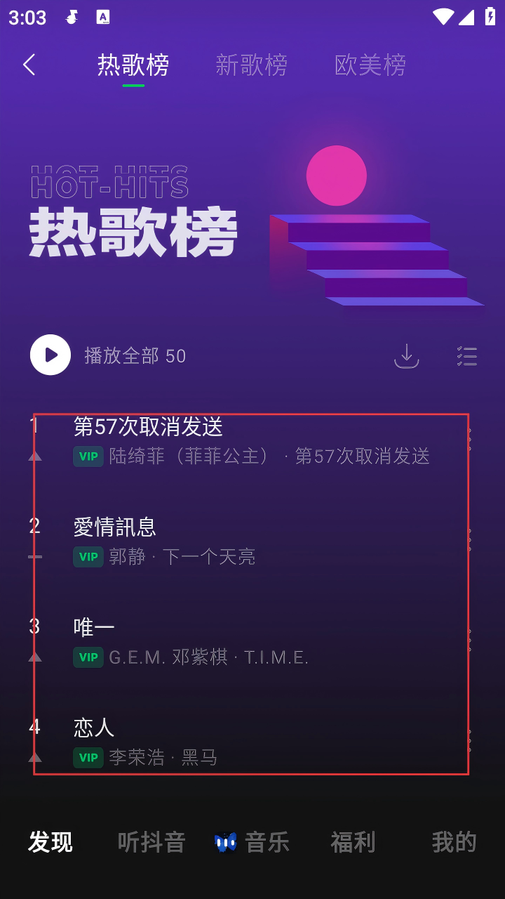 3、进入热歌榜页面,能看到榜单内的歌曲列表,方便挑选想听的热歌。