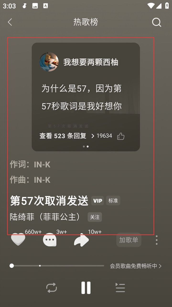 4、点击热歌榜里的歌曲,进入播放页面,可查看歌曲详情、评论,还能点赞、分享。