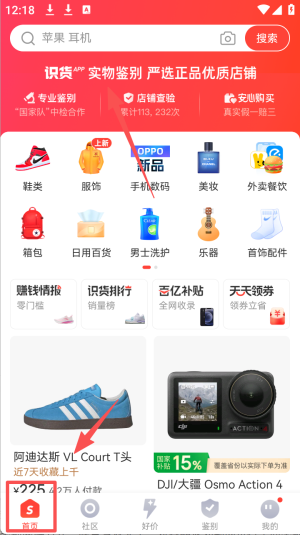 1、搜索商品:在首页搜索栏输入商品关键词,如“苹果耳机”,点击搜索查看结果。