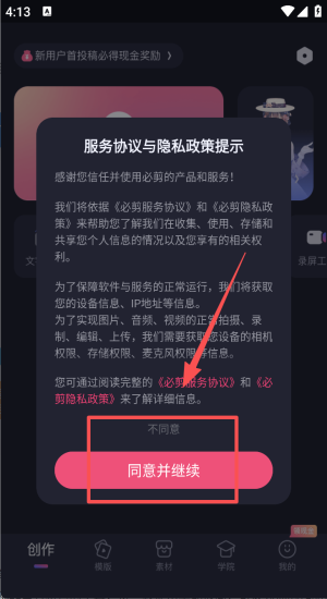 1、打开应用阅读服务协议与隐私政策后点击同意并继续。