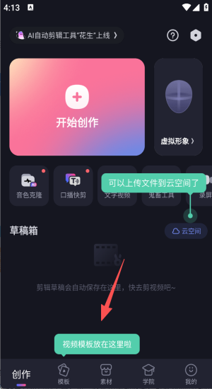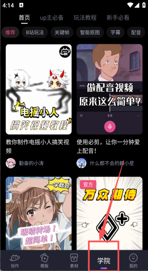 4、在学院区观看智能抠图、配音、关键帧教程提升成片质量。
