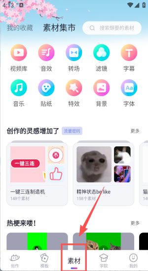 3、进入素材集市搜索并添加音乐、贴纸、转场、特效等素材。