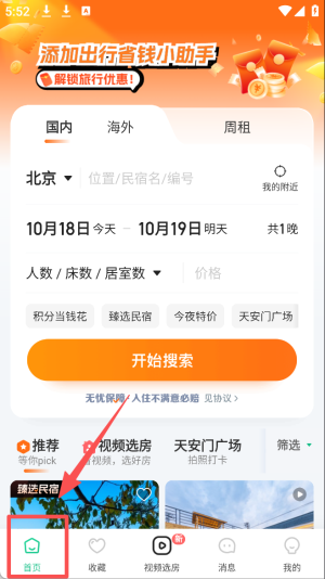 2、搜索租房:在首页输入目的地和日期,点击“开始搜索”查找房源。