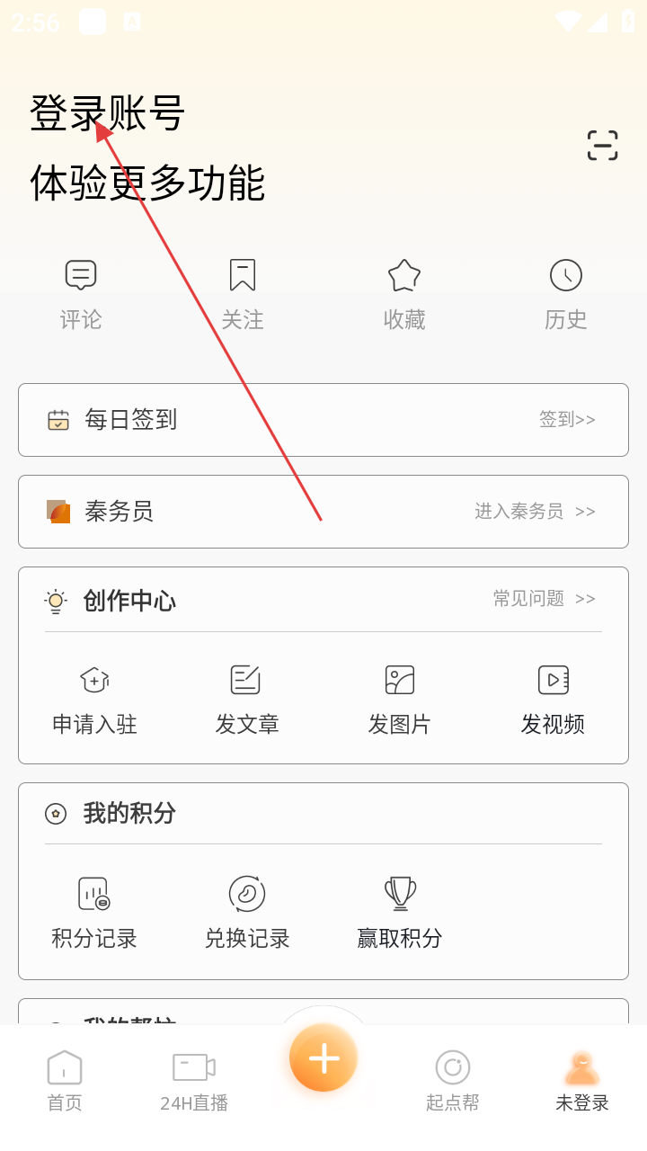 1、在起点新闻首页,可浏览各类新闻资讯,点击【未登录】进入登录相关页面,准备进行账号登录操作。