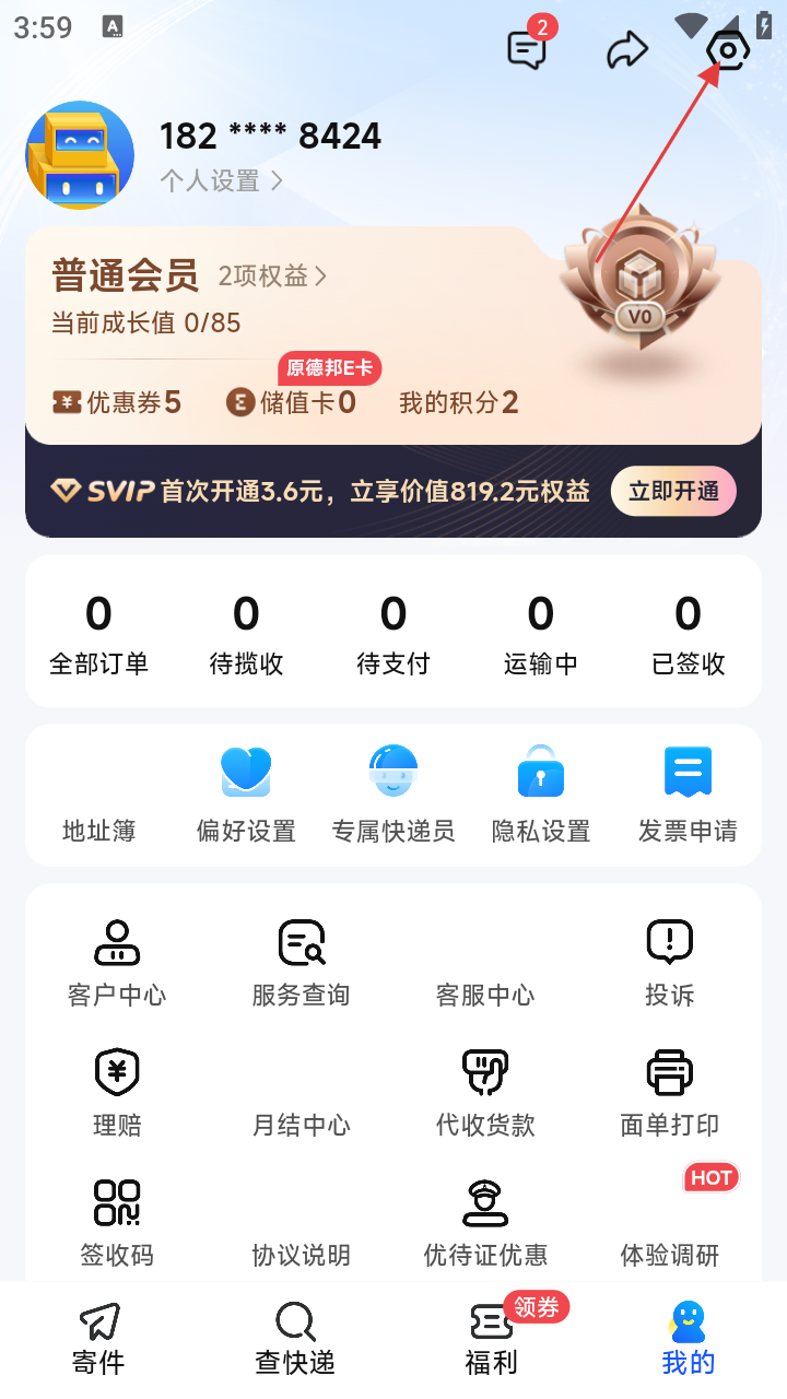 1、在德邦快递APP首页,点击右下角【我的】按钮,可进入个人中心,查看会员权益、订单状态等功能入口。