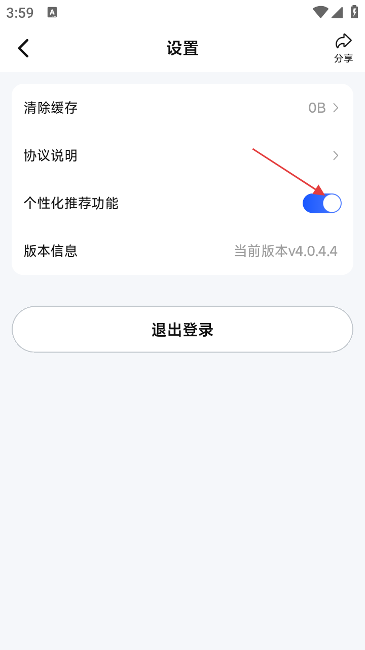 3、在设置界面中,找到【个性化推荐功能】选项,点击开关可关闭该功能,按需调整APP的推荐服务。