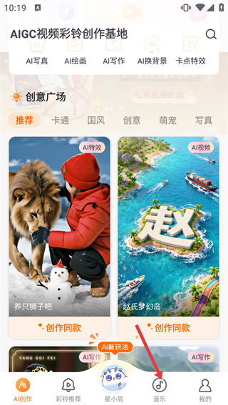 1、在视频彩铃创作基地界面,点击底部【音乐】选项,切换至音乐相关功能页面。