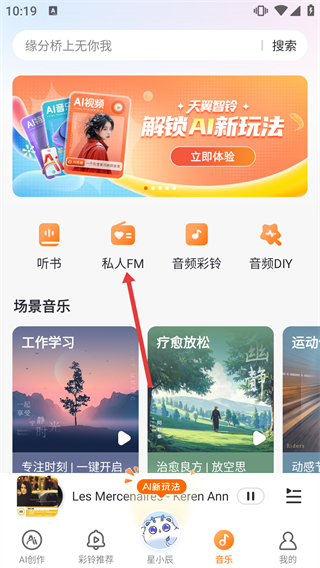 2、在音乐页面中,点击【私人FM】选项,进入对应的音乐FM播放界面。