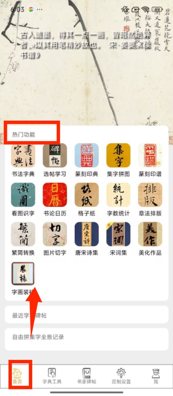 1、点击底部 “首页” 进入主界面,在热门功能区可找到书法字典、选帖学习等工具,快速开启书法相关操作。
