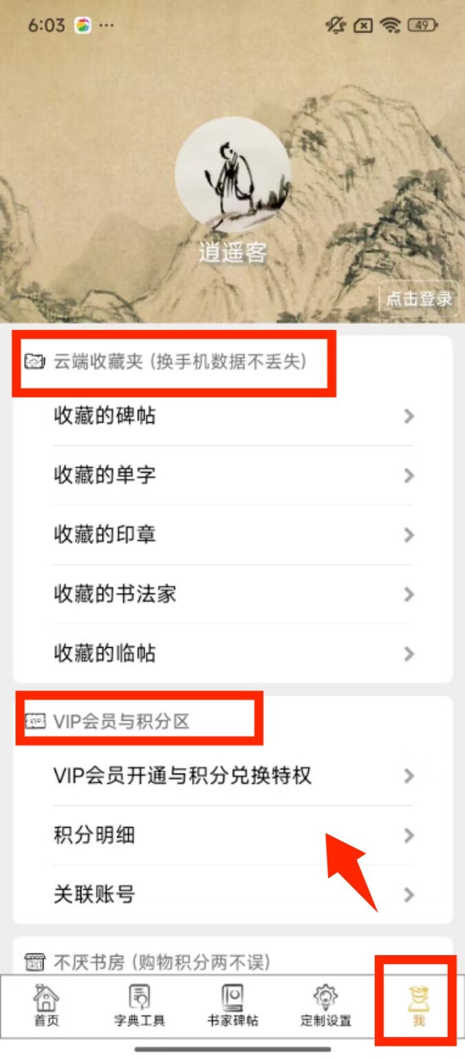 4、点击底部 “我” 进入个人页,可在云端收藏夹管理收藏的碑帖、单字,也能在会员区查看积分与特权。