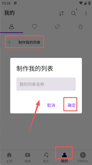 4、进“我的”输名点“确定”,专属列表自动生成随时播。