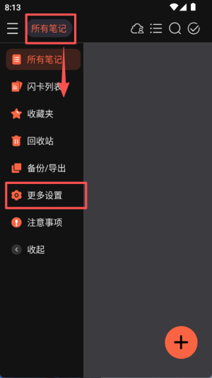 3、回到左侧菜单栏,在 “所有笔记” 分类下找到 “更多设置” 选项并点击,进入设置相关界面。