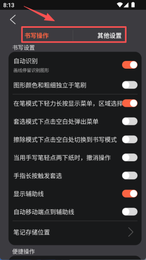 4、在设置页面选择 “书写操作” 标签,可看到自动识别图形、显示辅助线等多项书写相关的功能开关。
