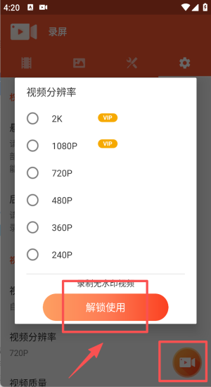 2、返回首页点击录屏按钮,再进入视频设置选择分辨率720P。