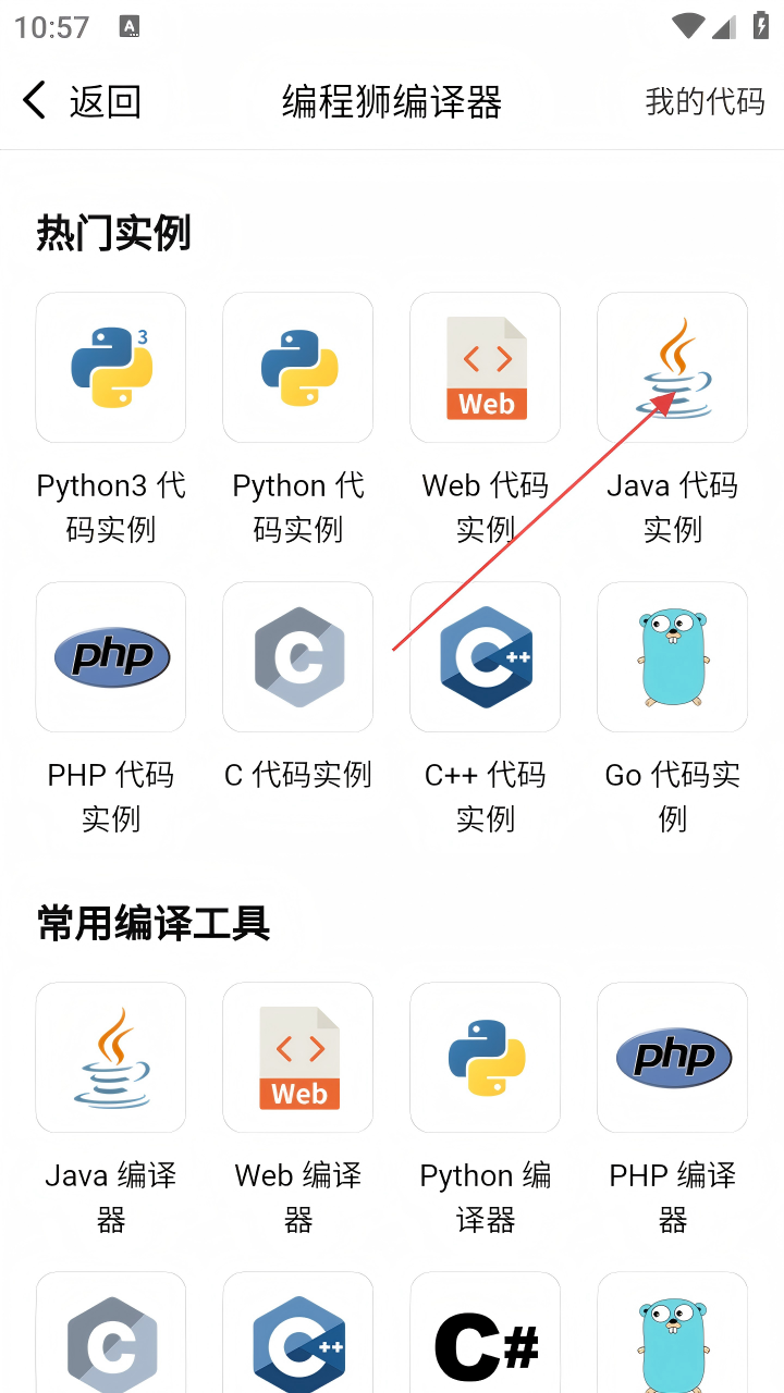 2、进入编译器页面后,在热门实例中找到【Java代码实例】并点击。