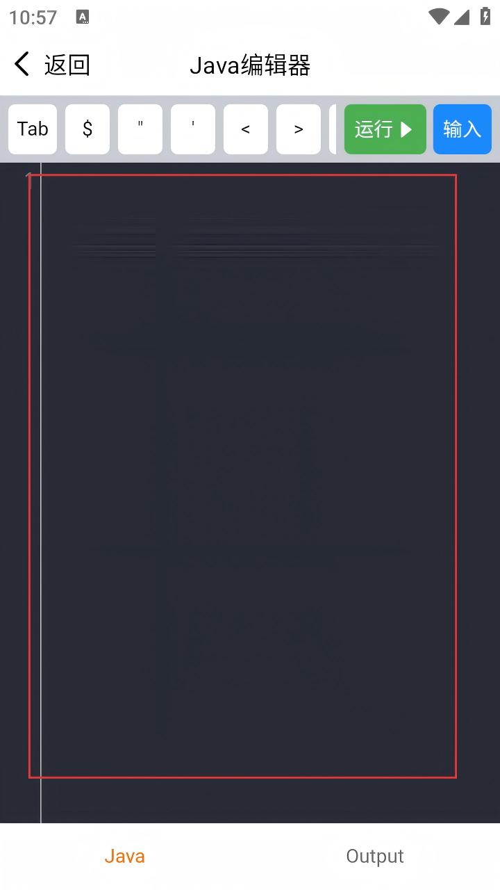 4、进入【Java编辑器】后,即可在编辑区域编写Java代码,编写完成后可点击【运行】按钮查看运行结果。