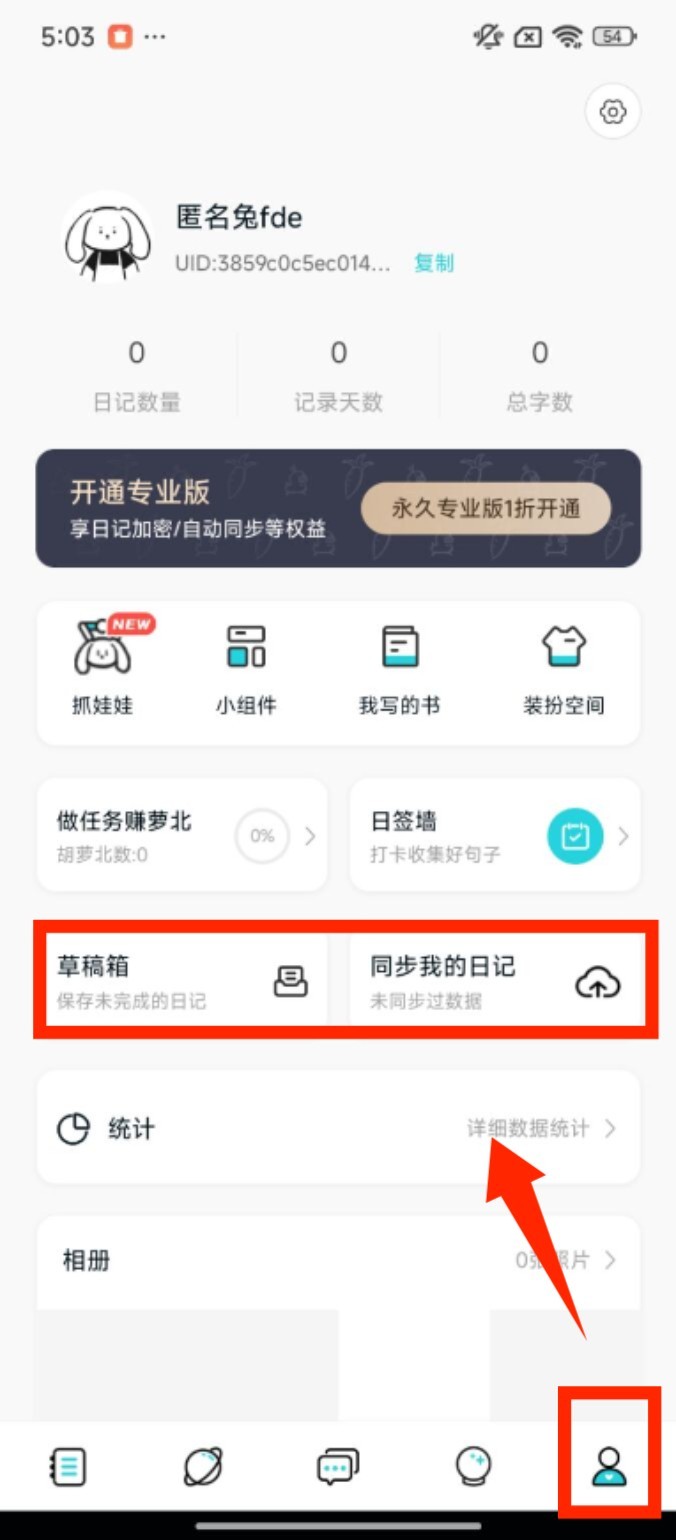 4、点击底部个人相关图标进入个人页,能找到草稿箱存放未完成内容,也可通过同步功能留存日记数据。