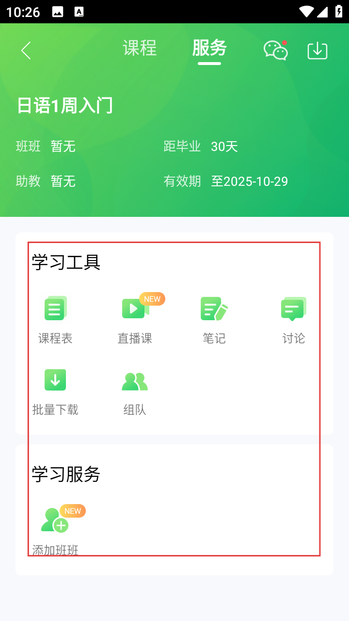 4、在服务页面,有【学习工具】和【学习服务】板块,可使用课程表、直播课等工具,也能添加班班。