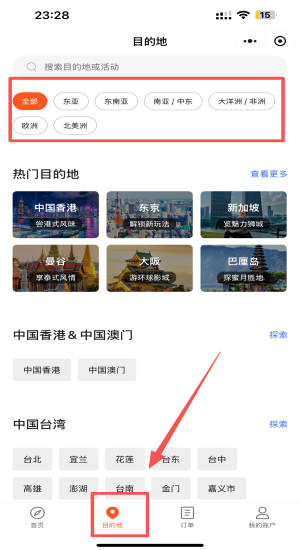 4、再搜“目的地”选东亚或东南亚,快速锁定港澳台及日韩热门城市。