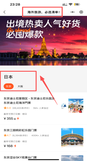 3、点“出境热卖”选东京迪士尼门票,查看评价后即可加购。