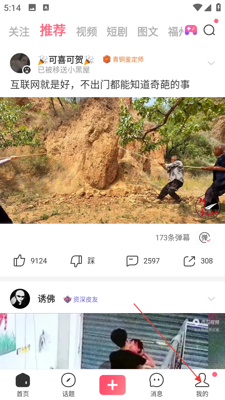 1、进入皮皮虾主界面,有【关注】【推荐】等分类,点击右下角【我的】,可进入个人相关页面。