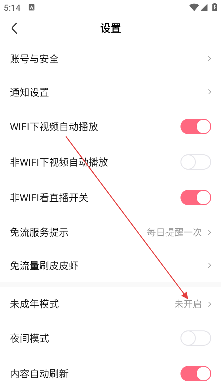 3、进入设置界面,有【账号与安全】【通知设置】等选项,找到【未成年模式】,点击可进入其设置页。
