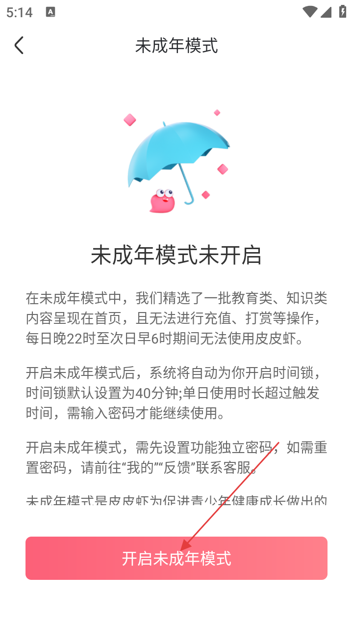 4、进入未成年模式设置页,能了解模式相关规则,点击【开启未成年模式】,即可开启该模式。