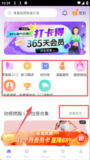 1、选择锻炼类型:在首页点击“动作库”或“减脂塑形”选择锻炼类型。
