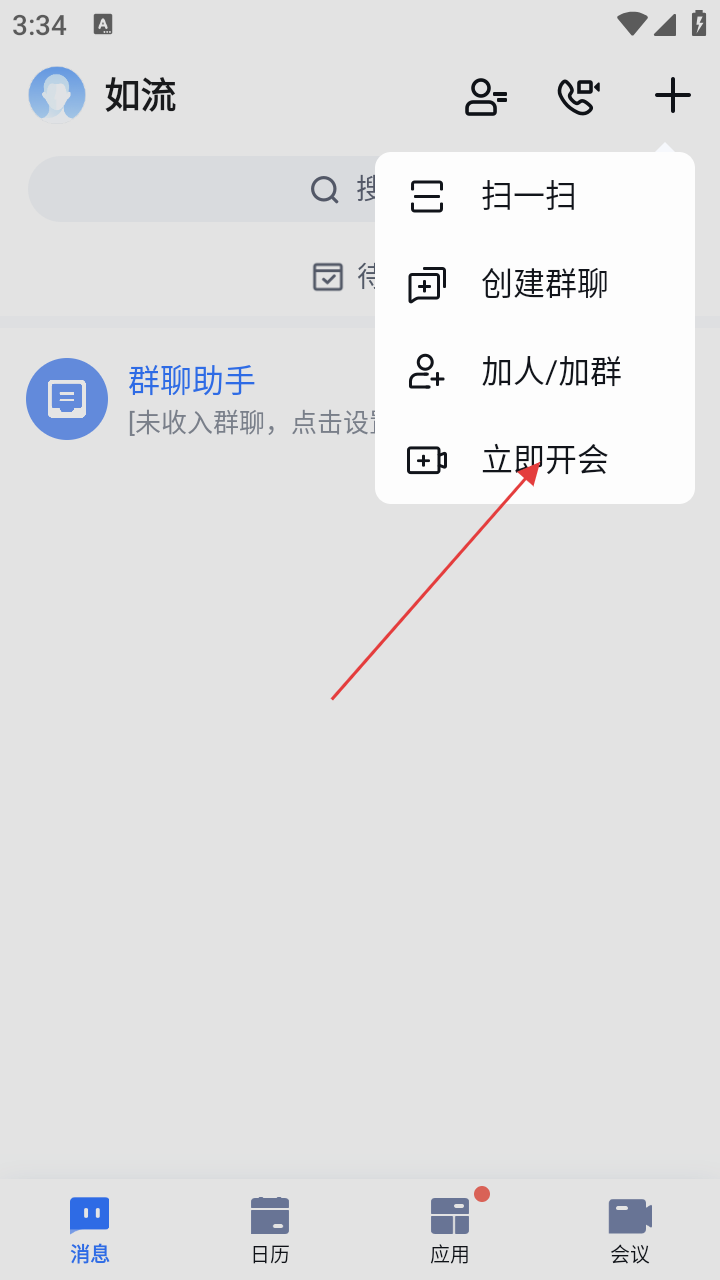 1、在如流APP消息页面,可查看群聊助手等消息,点击右上角“+”号进入功能选择界面。