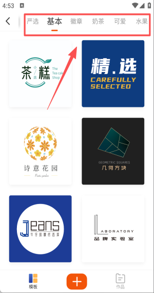 3、进入模板页选奶茶可爱或几何方块风格,挑中品牌模板即可一键进入编辑。