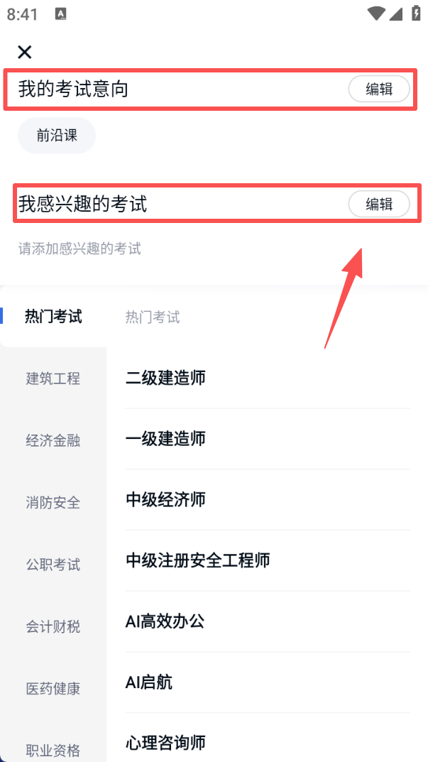 1、进入 “我的考试意向” 页面,找到 “我感兴趣的考试” 板块旁的编辑按钮,可从热门考试分类里添加目标考试类型。