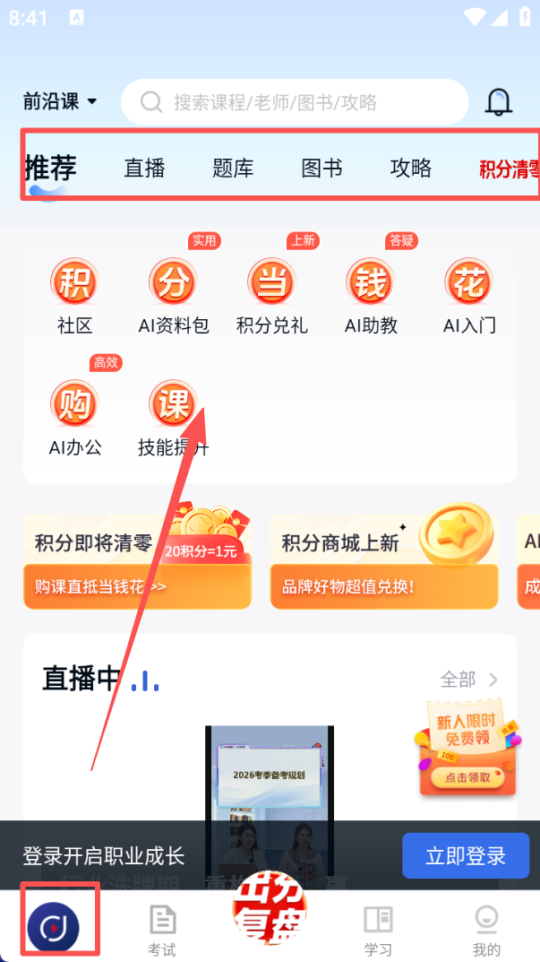 2、点击底部首页按钮,页面顶部有推荐、直播等板块,还能找到社区、AI 资料包等功能入口,浏览相关学习内容。