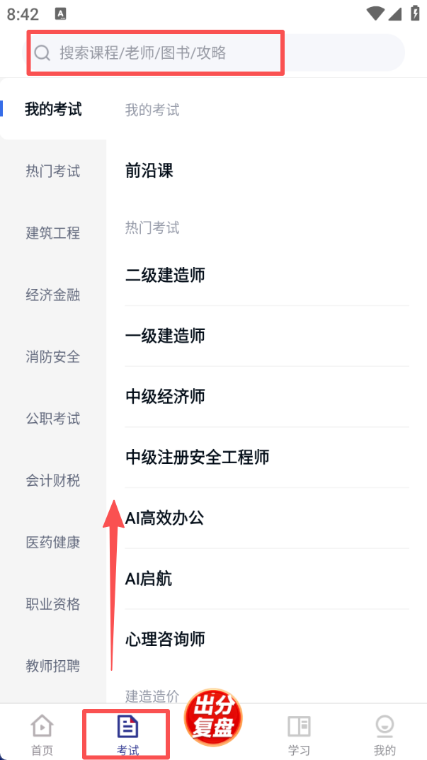3、切换到 “考试” 页面,顶部设有搜索栏可查找课程,左侧分类栏涵盖建筑工程等领域,右侧展示对应考试项目。