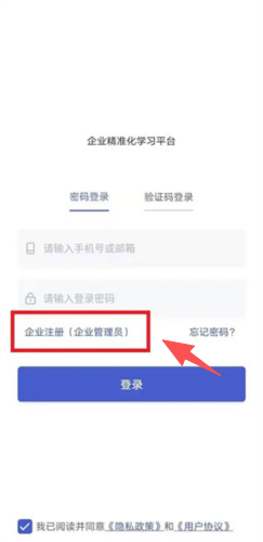 1、进入企业精准化学习平台的登录页,在密码登录选项旁,可找到 “企业注册(企业管理员)” 的入口并点击进入。