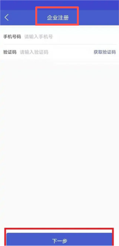 2、跳转至企业注册页面后,按提示填写手机号码,获取并填入验证码,随后点击页面底部的 “下一步” 按钮。